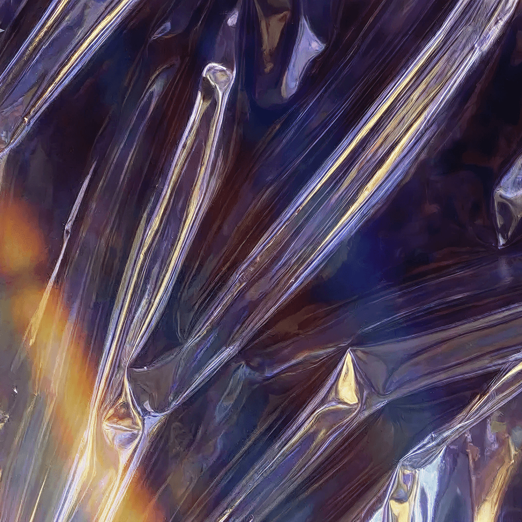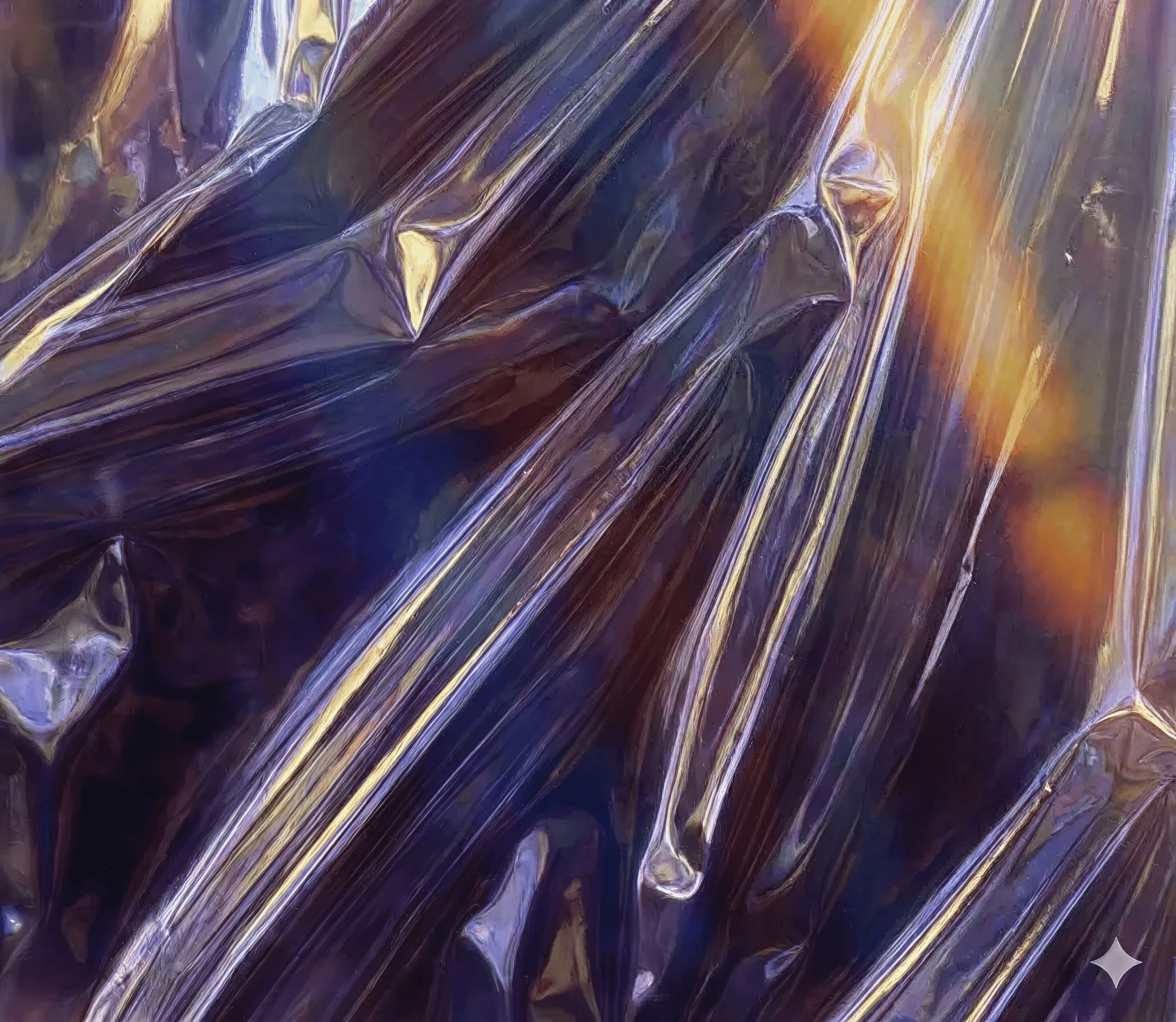 빛의 굴절이 만들어내는 순간적인 환영에 대하여 논하기에 앞서, 이 재질이 본질적으로 가지고 있는 인공적인 탄성과 그것이 외부의 압력에 의해 비가역적으로 변형된 상태, 즉 '주름'이라고 불리는 현상에 집중할 필요가 있다. 심연의 보랏빛을 기저에 깔고 있는 이 폴리염화비닐(PVC) 혹은 그와 유사한 합성수지의 표면은, 어딘가에서 날아온 강렬한 광원(가시광선 영역의 스펙트럼을 포함한)을 만나 정반사와 난반사를 동시에 일으키며 망막에 시각적 혼란을 야기한다. 당신이 지금 목격하고 있는 저 날카로운 황금색 섬광과 청록색의 번짐은 사실 물질 고유의 색상이 아닐 수도 있으며, 그것은 단지 표면의 매끄러움과 각도에 따라 당신의 뇌가 해석하는 빛의 파장 왜곡 현상에 불과하다는 사실을 인지해야만 한다.